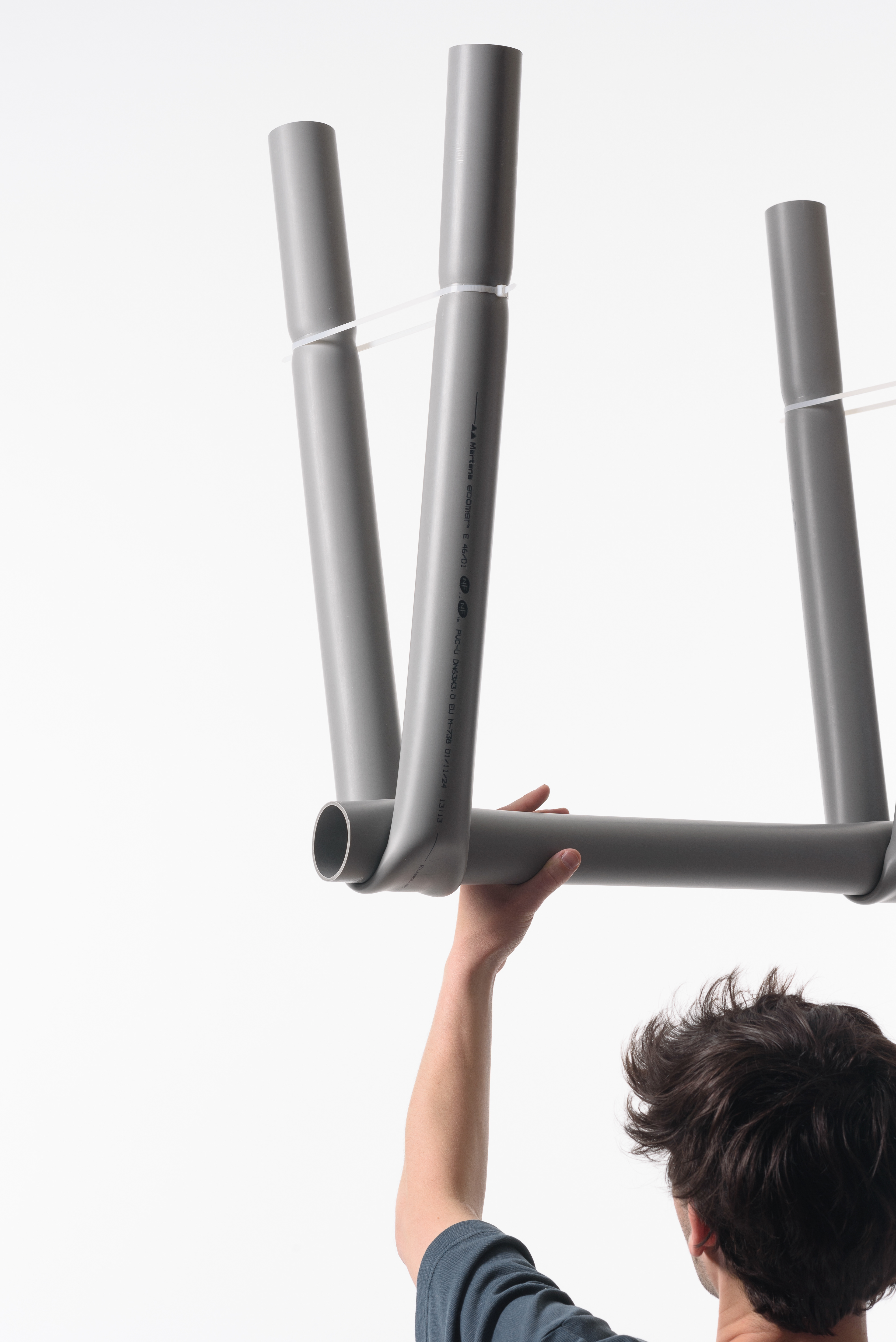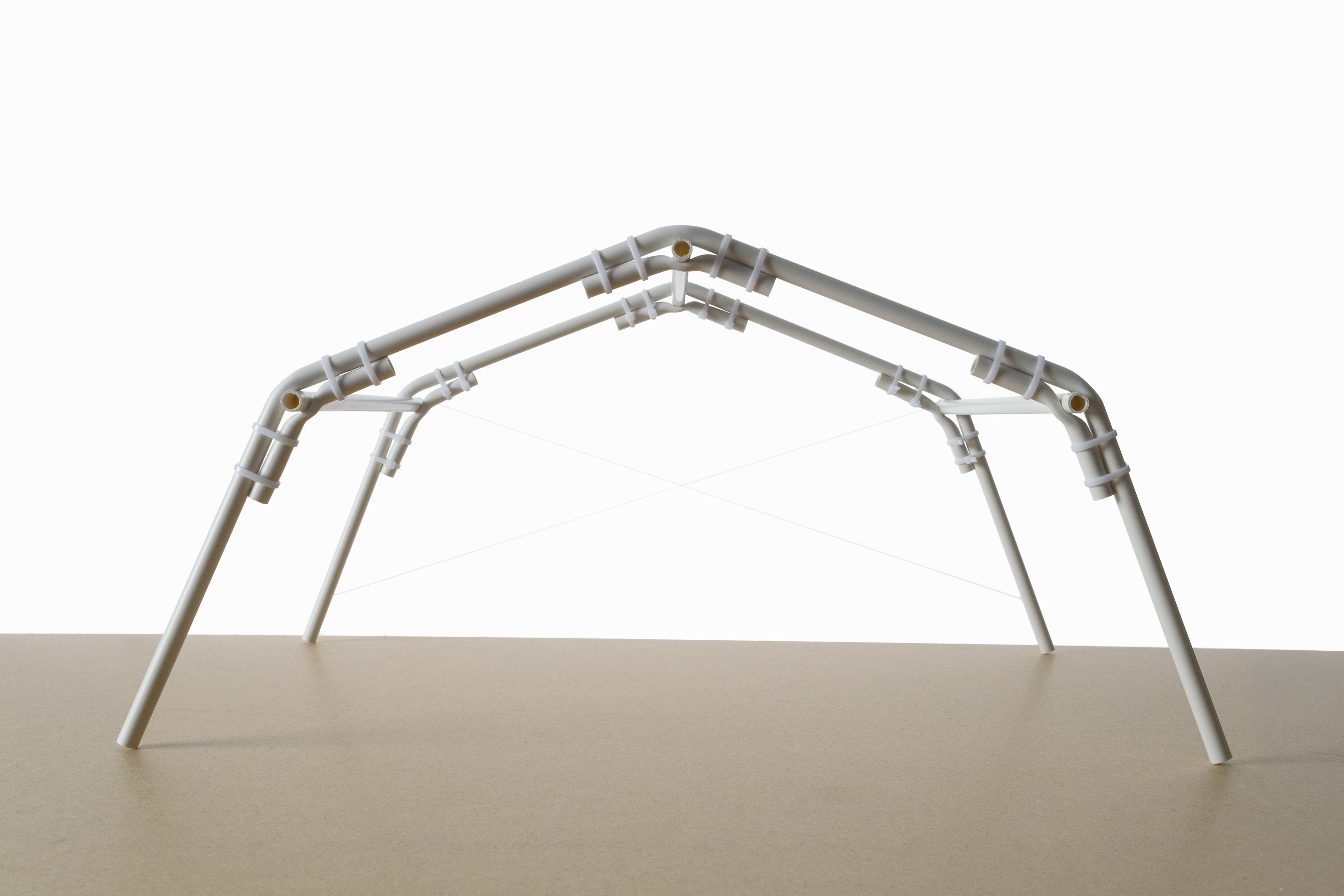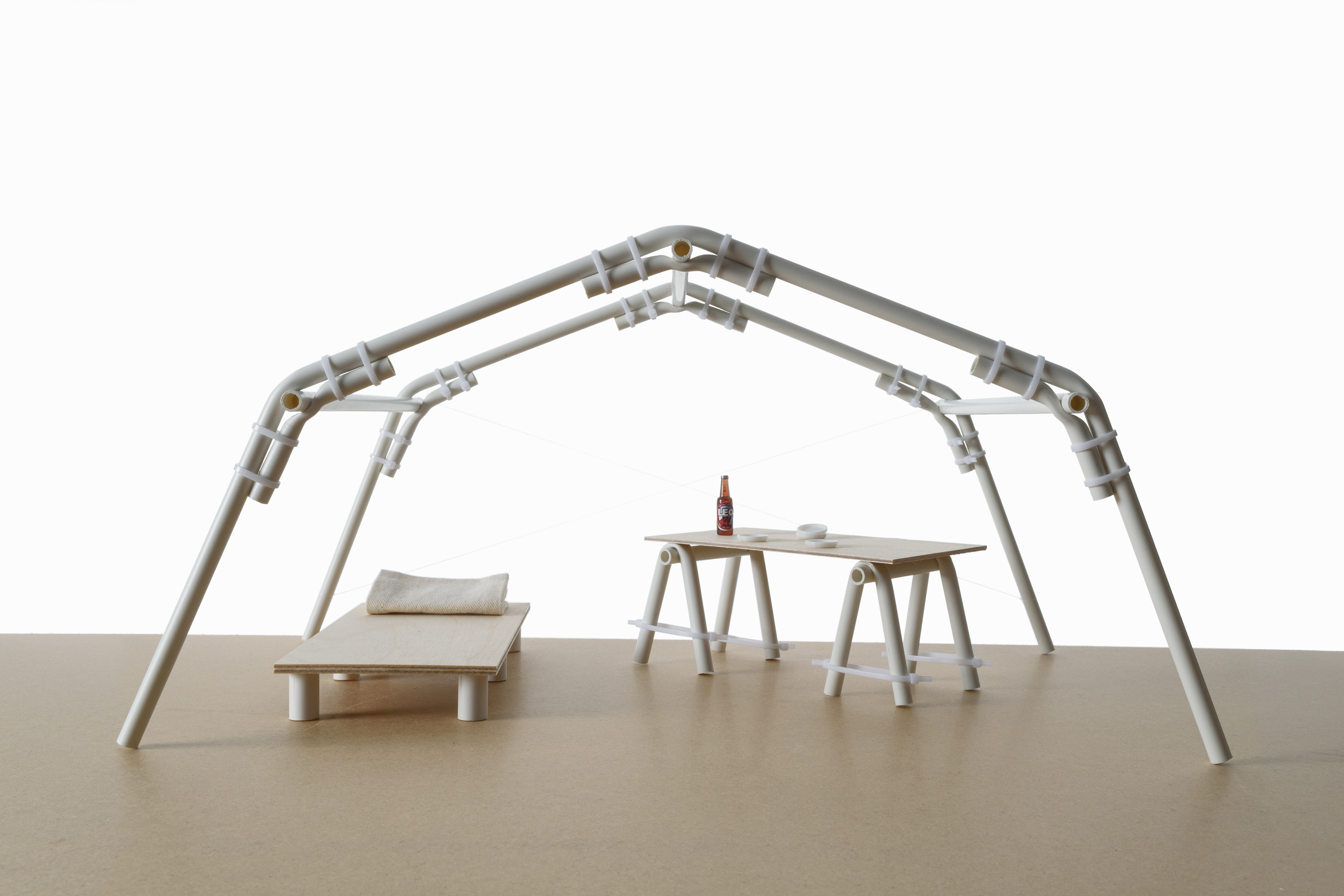 Par un procédé de cintrage à chaud de tubes en PVC, CINTRE propose des assemblages simples et structurants, permettant la construction intérieure comme extérieure d’abris en situation d’urgence.